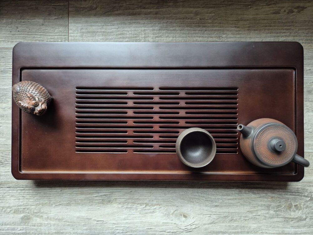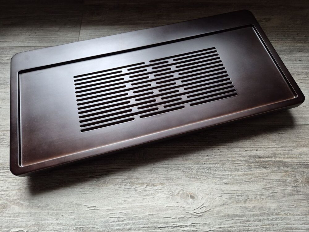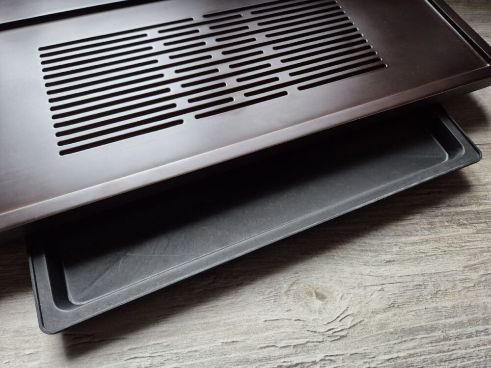 Довольно большая бамбуковая доска с пластиковым поддоном. Покрыта лаком, стыков на чайной поверхности нет. Рассыхаться нечему, даже при минимальном уходе прослужит долго.