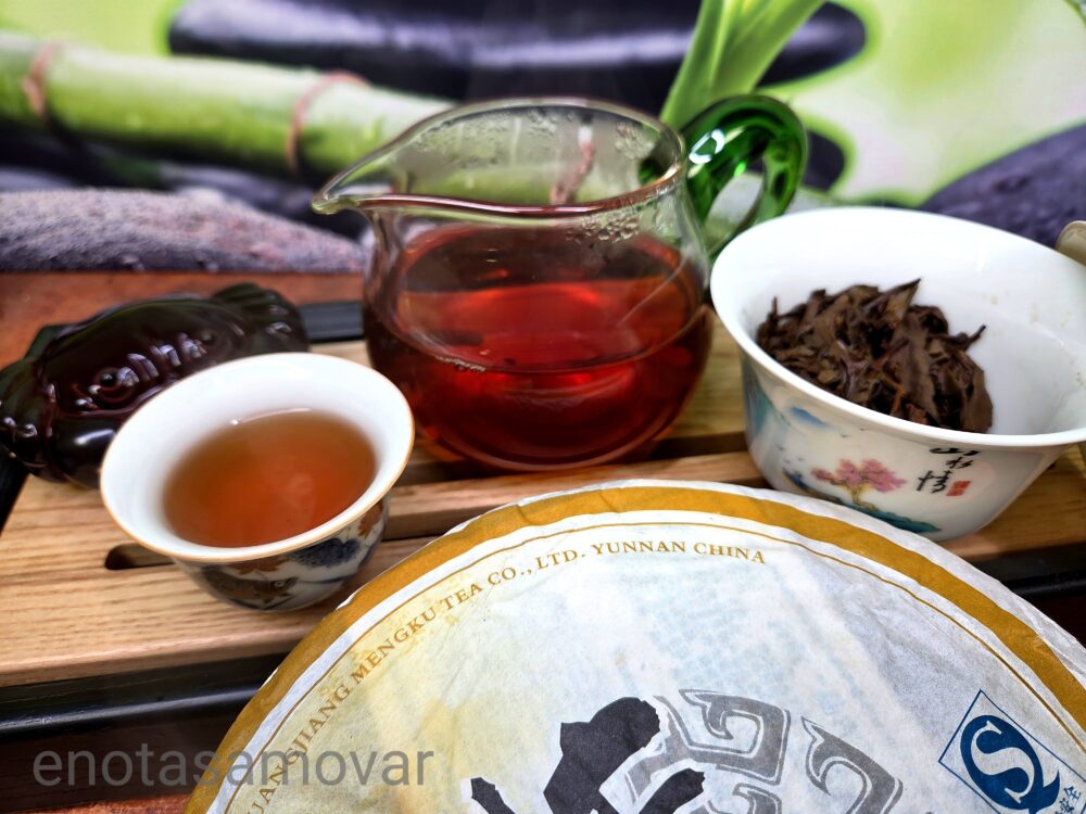 Давно и успешно продаётся практически легендарный (и самый часто подделываемый шен Мэнку) Манбо в зелёном оформлении, поэтому интересно было попробовать и этот блинчик! Настой медный, прозрачный, чистый. На вкус как компот из яблок и груш с лёгкими дымными нотками и капелькой мёда в послевкусии. По эффекту тонизирует, сосредотачивает, поднимает уровень позитива, внутренне согревает. Проливы держит так, что скорее всего дела отвлекут раньше, чем закончится чаепитие)